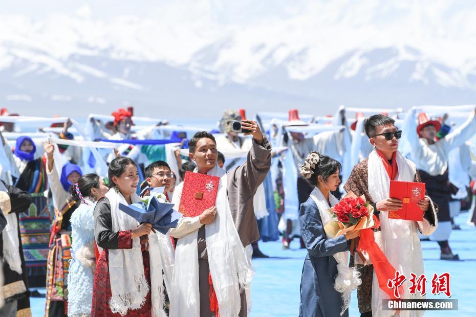 5月19日,隨著氣溫升高,西藏納木錯(cuò)解凍開(kāi)湖,迎接即將到來(lái)的旅游旺季。納木錯(cuò),藏語(yǔ)意為“天湖”。圖為納木措開(kāi)湖儀式上舉辦集體藏式婚禮。