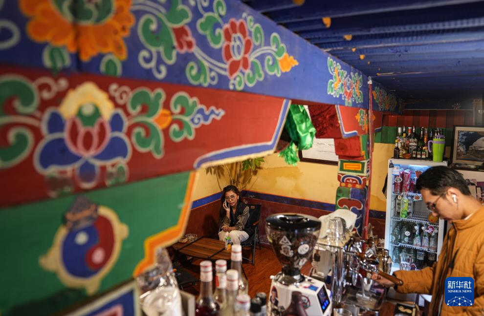 位于八廓南街的貢桑孜大院,擁有百年歷史的藏式樓房,如今煥發(fā)出新的生機。走進大院,一樓的西北角,一間藏式裝修風(fēng)格的咖啡館內(nèi),顧客穿梭其中,咖啡香氣四溢,讓這座古老的大院充滿活力。
