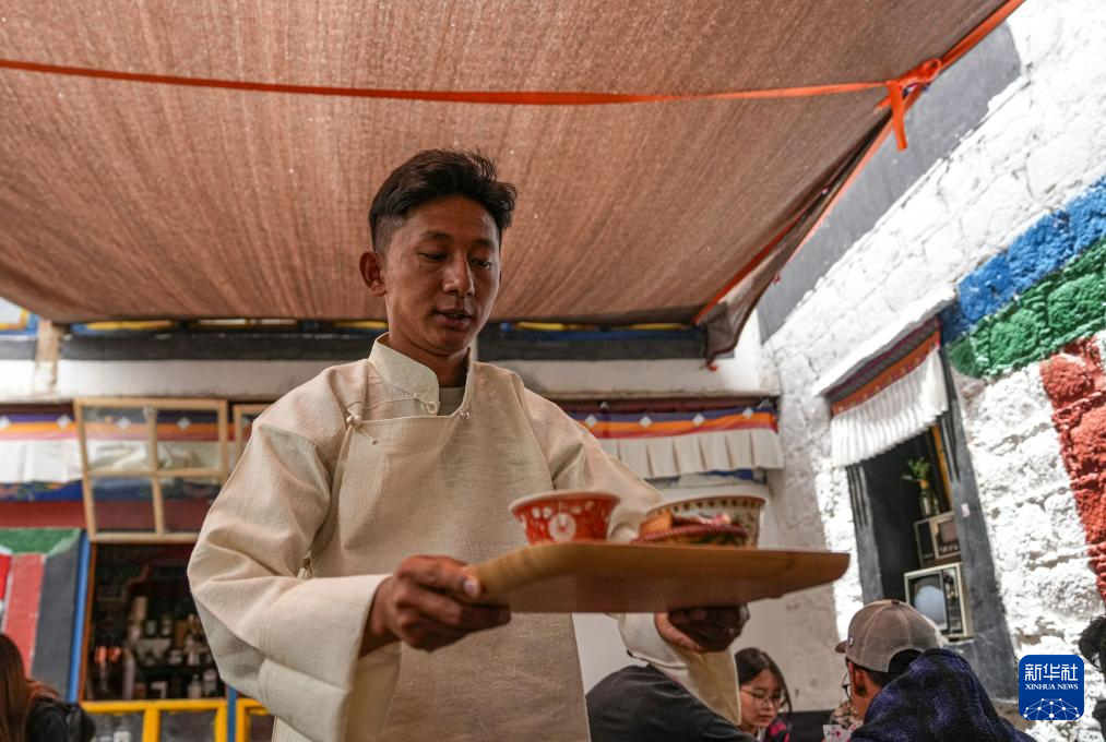 旦增特覺在為顧客奉上咖啡(7月5日攝)。新華社發(fā)(格桑雍珍 攝)