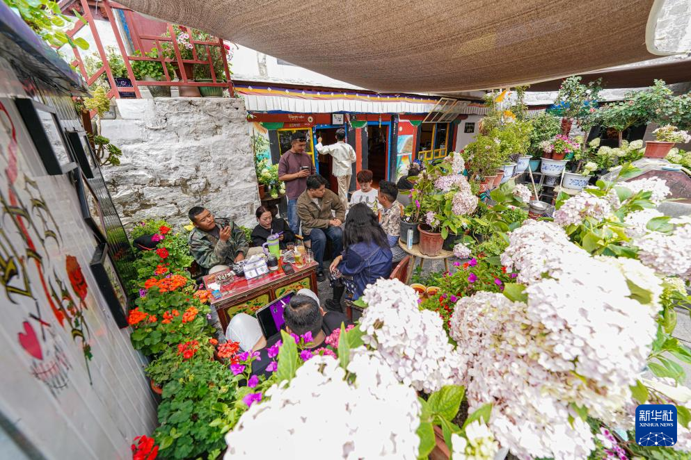 鮮花簇擁下的古院咖啡館一角(7月5日攝)。新華社記者 晉美多吉 攝