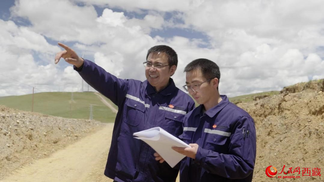 國家能源集團西藏那曲分公司副總經理胡建生(左一)和同事在一起工作。人民網記者 趙晨攝