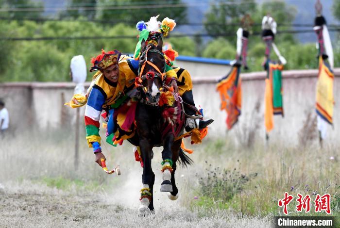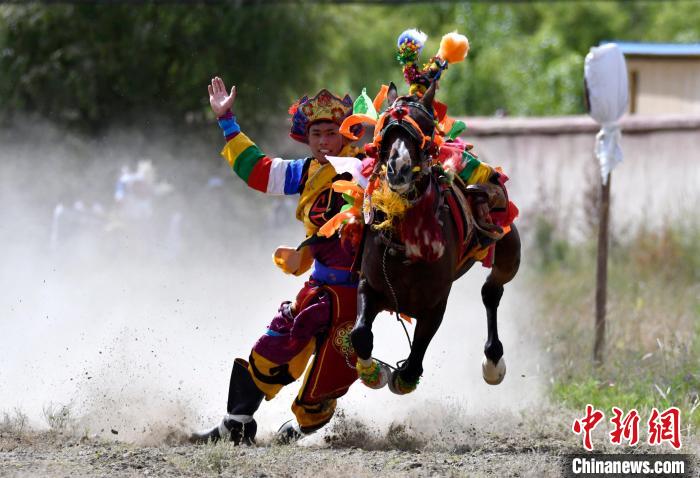 7月27日,西藏拉薩市桑達(dá)村迎來“望果節(jié)”,村民們舉行賽馬活動慶祝?!巴?jié)”是西藏傳統(tǒng)的豐收節(jié),具體日期隨各地莊稼成熟的時間而變化?!巴?jié)”期間,按照習(xí)俗,各地都會舉辦賽馬比賽。圖為騎手進行馬術(shù)表演。中新社記者 李林 攝