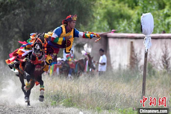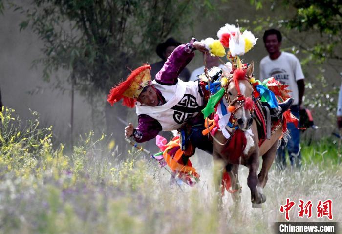 7月27日,西藏拉薩市桑達(dá)村迎來“望果節(jié)”,村民們舉行賽馬活動慶祝。“望果節(jié)”是西藏傳統(tǒng)的豐收節(jié),具體日期隨各地莊稼成熟的時間而變化。“望果節(jié)”期間,按照習(xí)俗,各地都會舉辦賽馬比賽。圖為騎手進行馬上射箭表演。中新社記者 李林 攝