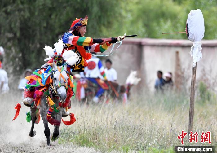 7月27日,西藏拉薩市桑達(dá)村迎來“望果節(jié)”,村民們舉行賽馬活動慶祝?!巴?jié)”是西藏傳統(tǒng)的豐收節(jié),具體日期隨各地莊稼成熟的時間而變化?!巴?jié)”期間,按照習(xí)俗,各地都會舉辦賽馬比賽。圖為騎手進行馬上射擊表演。中新社記者 李林 攝