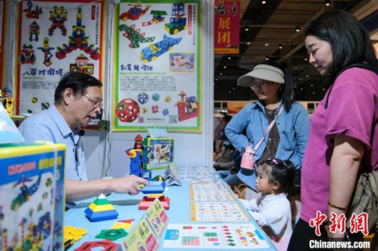 8月7日,臺(tái)灣博士?jī)簩?shí)業(yè)有限公司總經(jīng)理葉國(guó)義(左)在展覽現(xiàn)場(chǎng)演示益智教具。中新社記者 江飛波 攝