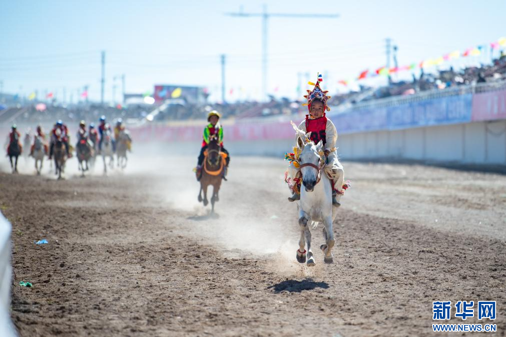 8月11日,騎手在場內(nèi)速跑一萬米比賽中。新華網(wǎng) 旦增努布 攝