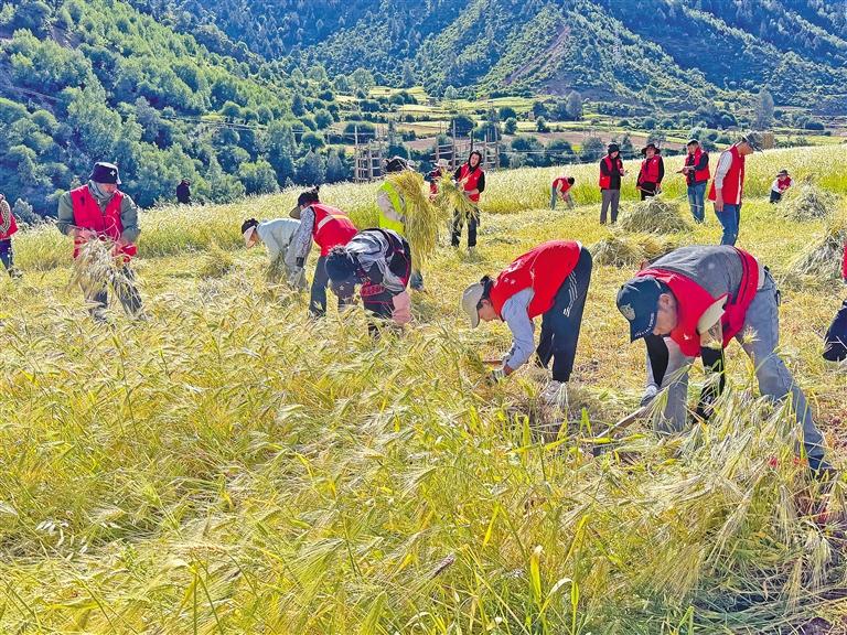 圖為黨員干部與群眾一起收割青稞。卓瑪群錯(cuò) 記者 平措郎加 攝