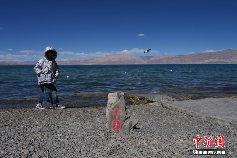 10月4日,一名小游客經(jīng)過(guò)班公湖畔的“中國(guó)”石碑。“十一”國(guó)慶假期,西藏日土縣班公湖吸引不少游客觀光游覽。中新社記者 崔楠 攝