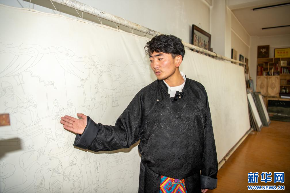 10月17日,卡若區(qū)嘎瑪鄉(xiāng)比如村的畫師鄧珠尼瑪在講述新主題唐卡創(chuàng)新過程。新華網(wǎng) 旦增努布 攝