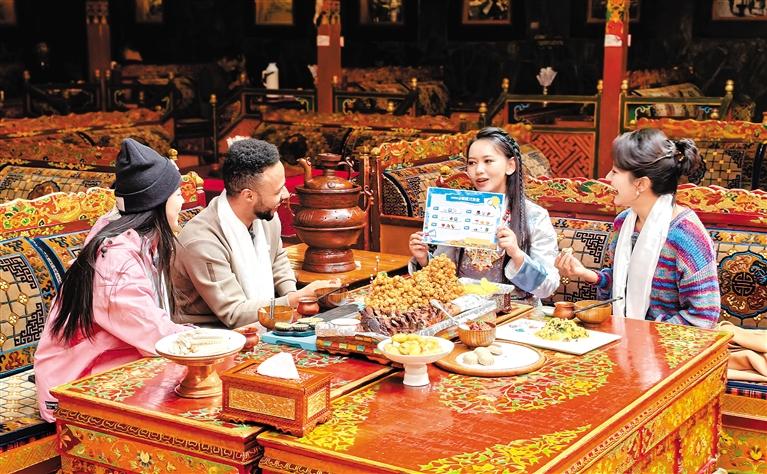 “在我們餐廳,經(jīng)常能看到不同民族、不同地方的人們同吃一道菜、共飲一壺茶的場景,大家其樂融融,就像一家人一樣?!辈惋嫹?wù)人員益西說。