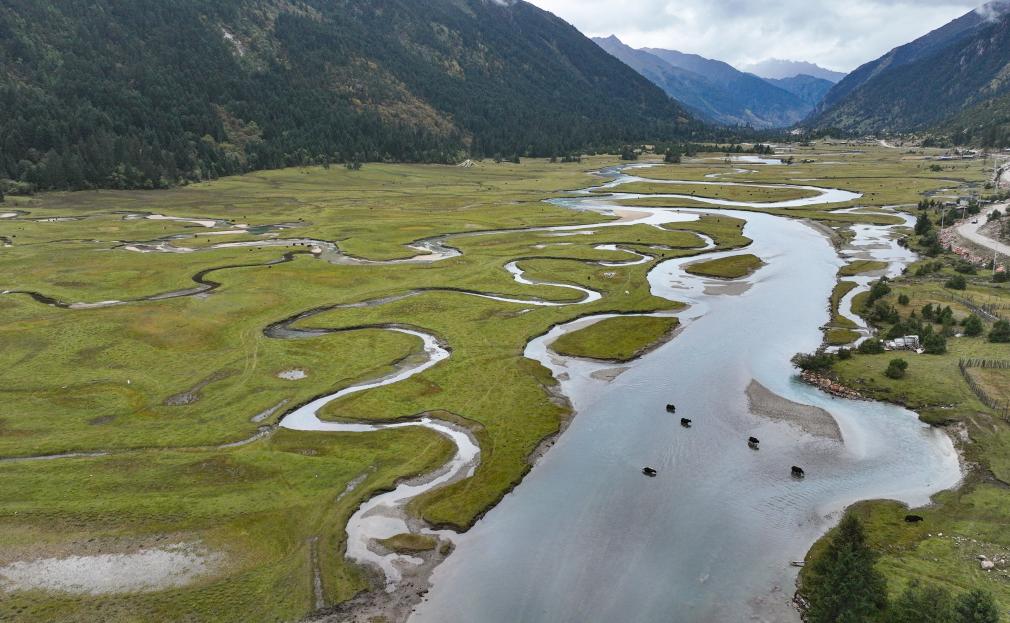 10月4日,在林芝工布江達(dá)縣,一隊(duì)牦牛涉水通過(guò)河流(無(wú)人機(jī)照片)。新華社記者 晉美多吉 攝 ??