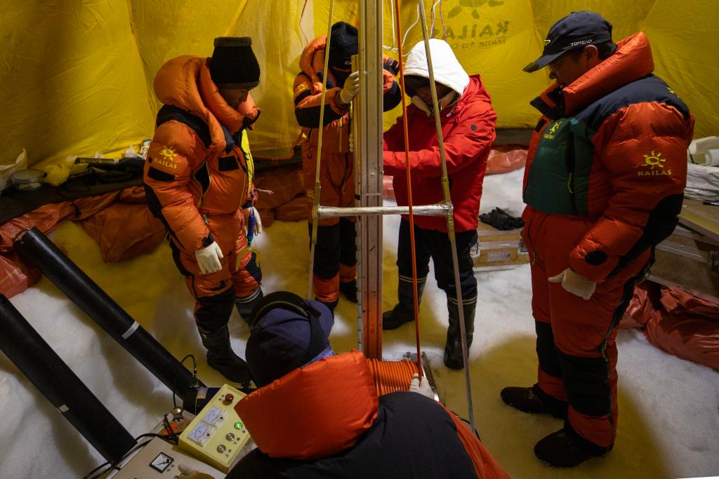 連日來,徐柏青帶領(lǐng)著團隊在海拔6100多米的冰原頂部安營扎寨、頂風冒雪,最終以324米的長度打破世界紀錄,成為全球中低緯度冰川最長冰芯。