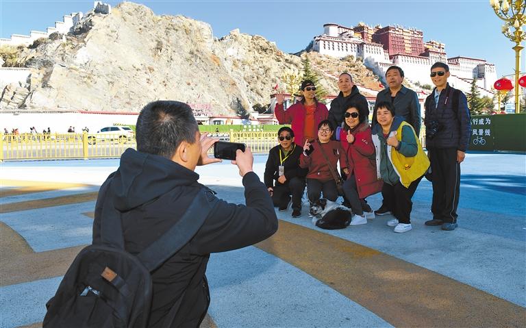 圖為近日,游客在布達(dá)拉宮廣場合影留念。記者 唐斌 攝