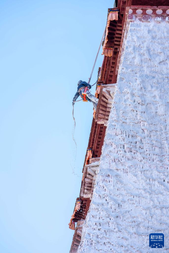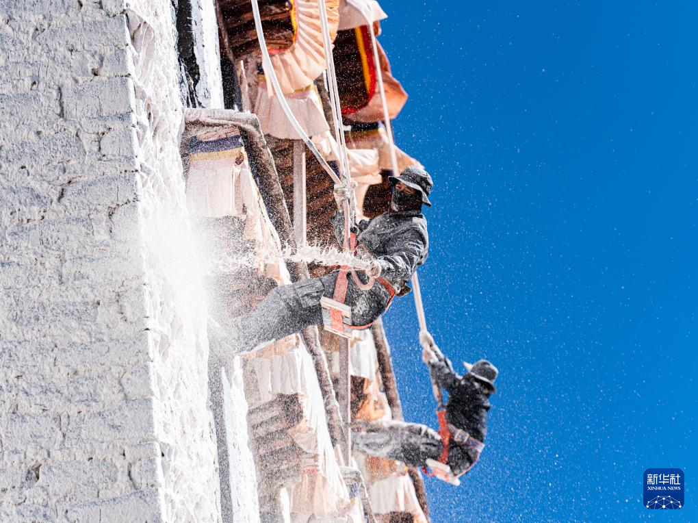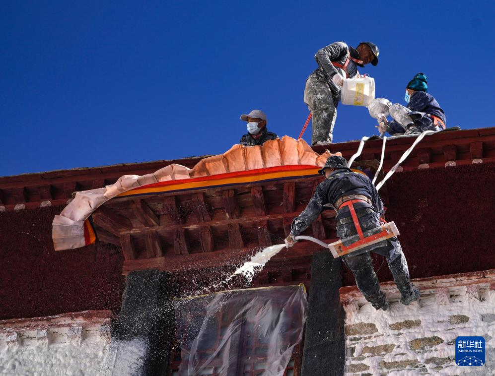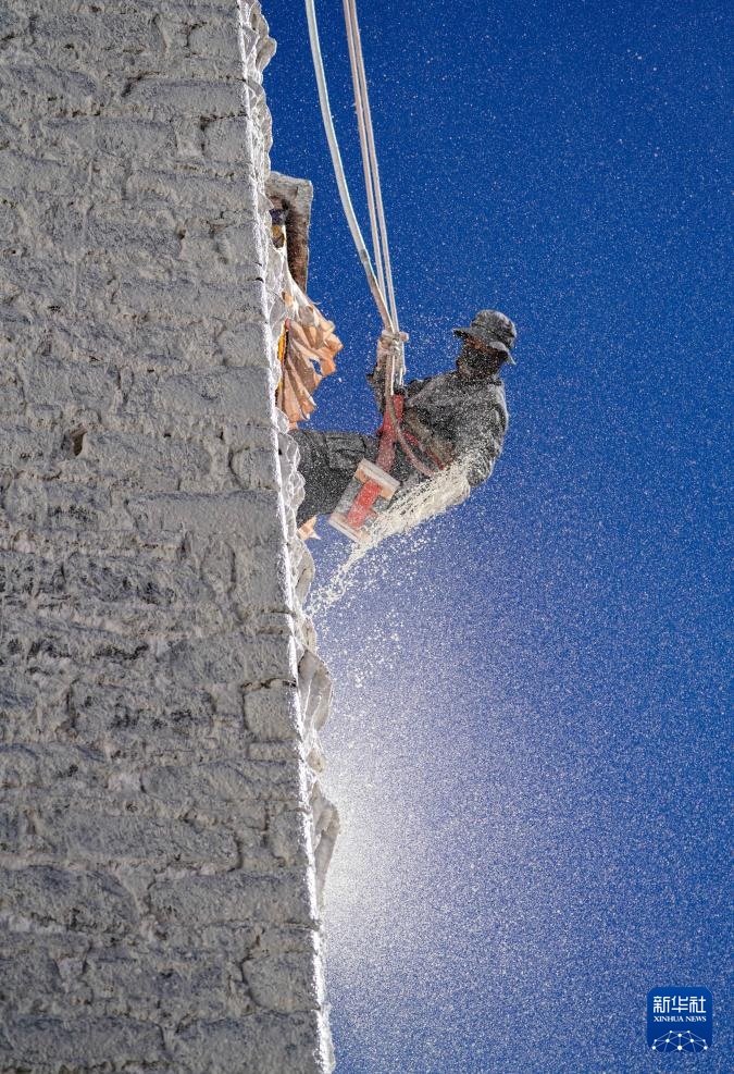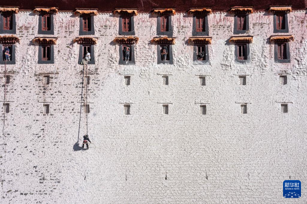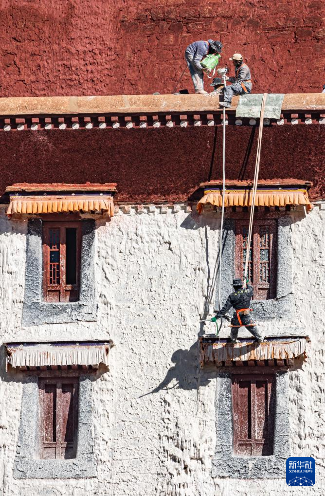 10月30日,布達(dá)拉宮管理處的工作人員在噴灑涂料。新華社記者 晉美多吉 攝 ??