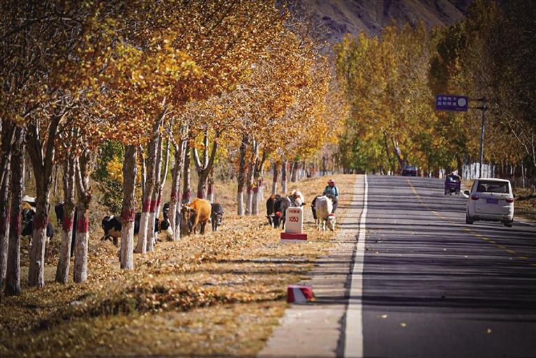 G318被稱為“中國(guó)景觀大道”,沿途壯麗絕美的風(fēng)光令人心醉神迷。恰風(fēng)和日麗的一天,記者一行驅(qū)車前往G318曲水段與達(dá)孜段。一路層林盡染,落葉飄飛,如詩(shī)如畫(huà),美不勝收。