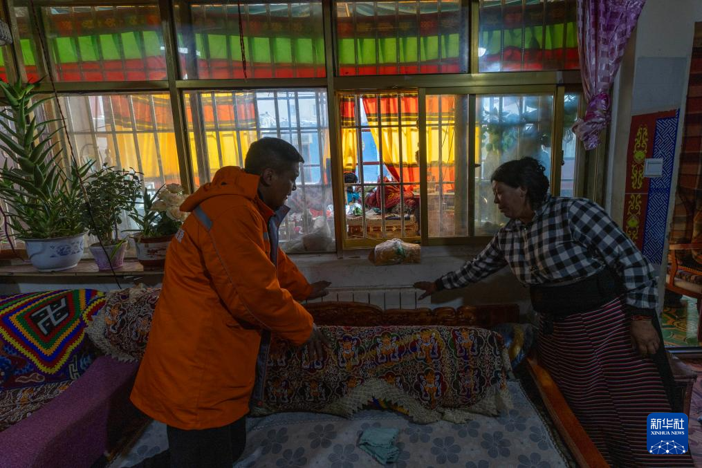 措勤縣城區(qū)清潔能源集中供暖特許經(jīng)營項(xiàng)目工作人員次旺羅布(左)在扎日南木錯(cuò)社區(qū)居民曲珍家查看供暖情況(11月20日攝)。新華社記者 姜帆 攝 ??
