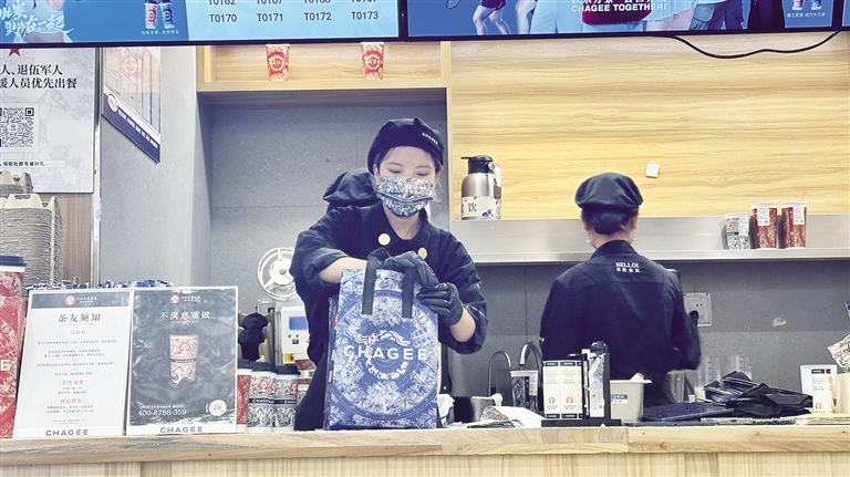 店員正在打包奶茶。