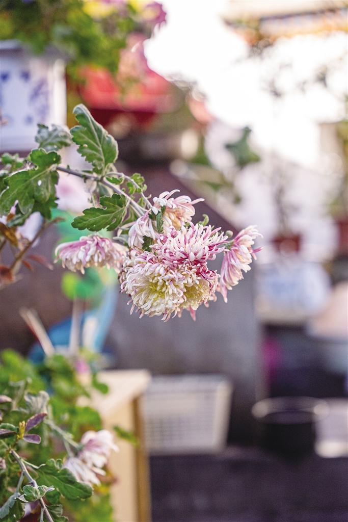 走進(jìn)八廓街、穿過繁華的大昭寺廣場(chǎng),沿著古巷小路便能來到貢桑孜大院。邁入大院,首先映入眼簾的是獨(dú)具韻味的傳統(tǒng)藏式建筑風(fēng)格,白墻、紅頂、黑窗沿,陽(yáng)光滲過在微風(fēng)中飄動(dòng)的“香布”,稀稀散散地落在精美的木雕窗花上,襯得陽(yáng)臺(tái)木制立柱上的花紋分外醒目。各式花卉與居民生活用品一同擺放在四四方方的院落中,卻并不顯得擁擠,反而增添了一絲浪漫的煙火氣。