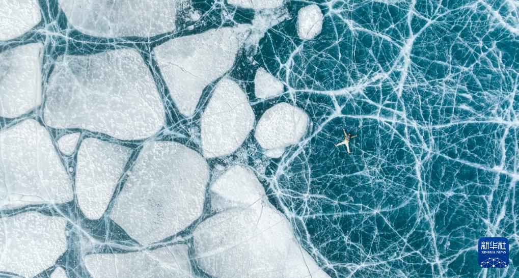 一名游客躺在恰央錯(cuò)結(jié)冰的湖面上拍照(1月26日攝,無人機(jī)照片)。新華社記者 丁增尼達(dá) 攝