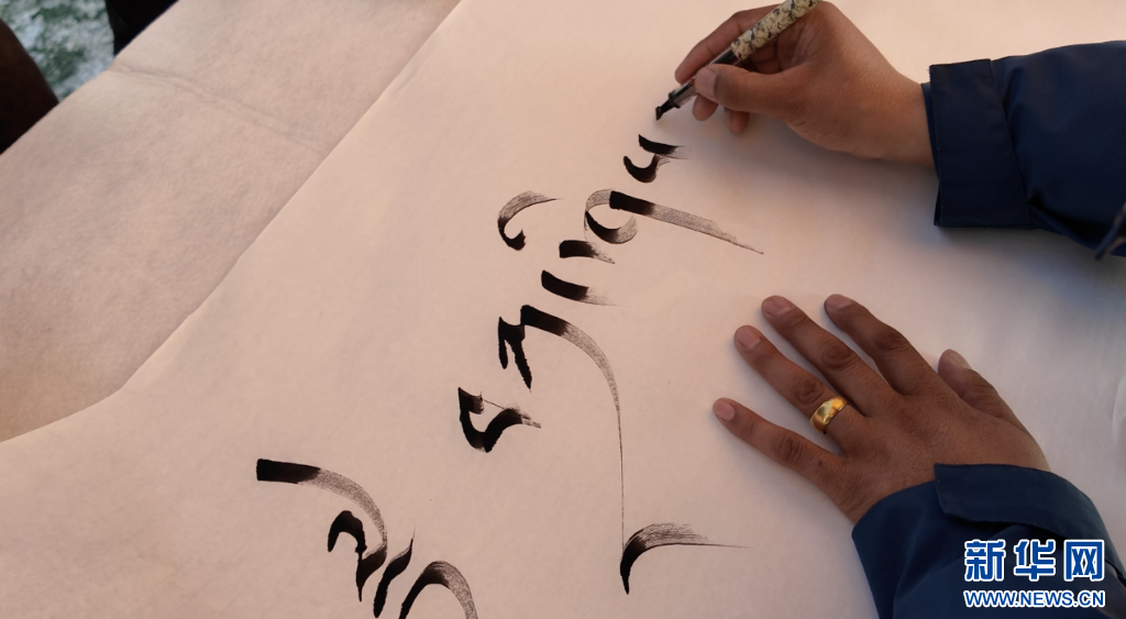 2月18日,商戶在現(xiàn)場書寫藏文節(jié)日祝詞。新華網(wǎng)發(fā) 朱俊 攝