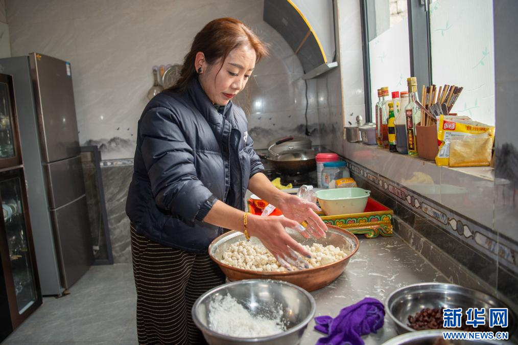 2月27日,扎西曲登社區(qū)31號(hào)民宿的民宿管家在制作“古突”。新華網(wǎng) 旦增努布 攝