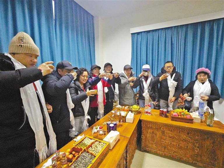 “古突”之夜,“走進(jìn)雪域邊陲 體驗藏歷新年”旅游團(tuán)游客在玉麥以酥油茶代酒,祝賀藏歷新年,祝福祖國繁榮昌盛。