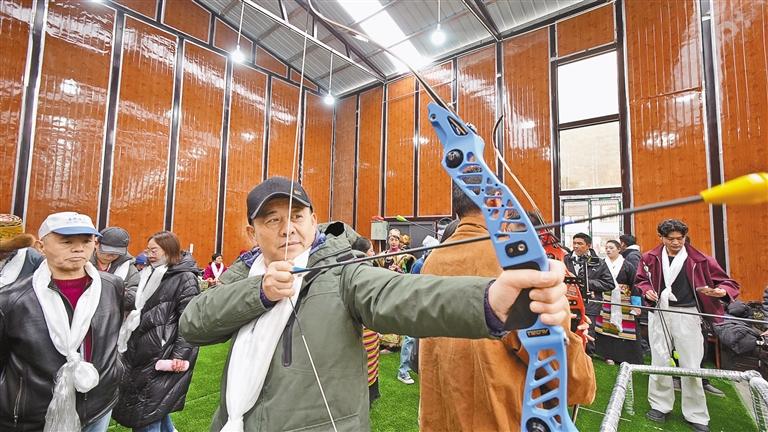 游客在扎日鎮(zhèn)體驗當(dāng)?shù)貍鹘y(tǒng)體育項目——響箭。