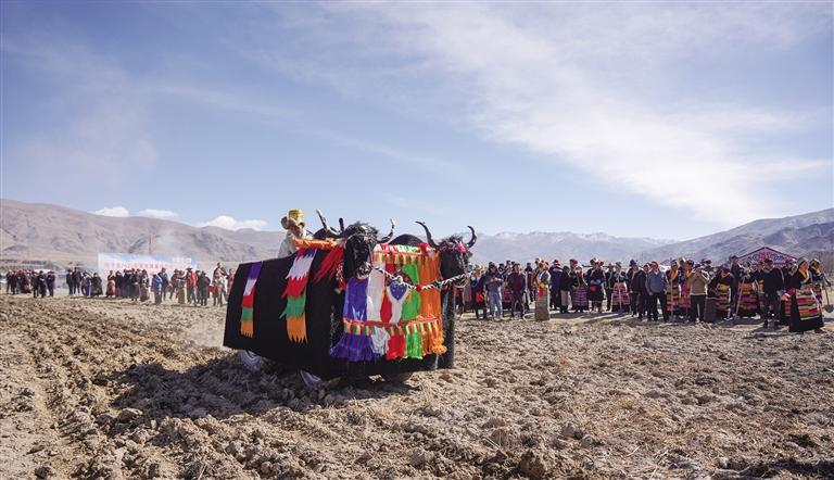 裝飾華美犄角掛飾的“機(jī)械牦?!薄侠瓩C(jī)緩緩駛?cè)胩锂?,在沉睡了一冬的凍土上犁出第一道深褐色溝壑。這一具有特殊意義的儀式過后,機(jī)械的轟鳴聲響徹田野,嶄新的犁地機(jī)、播種機(jī)閃亮登場(chǎng)。鋼鐵履帶滾滾向前,所到之處,土地被高效翻整;播種機(jī)精準(zhǔn)播撒,黑色的青稞種子顆顆入土。