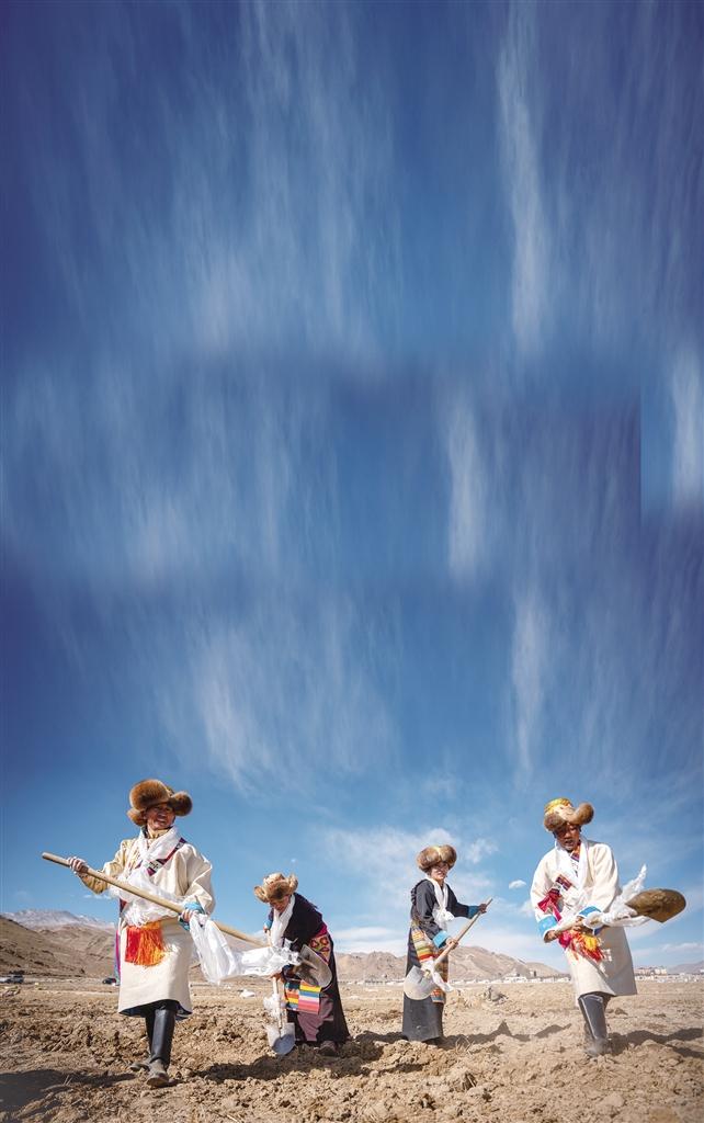 切瑪、德卡、黑青稞酒……現(xiàn)場(chǎng)布置隆重且有儀式感,男女村民整齊列隊(duì),各站一排,男性村民手里抓著一把糌粑,嘴里念著祈愿詞,向著澄澈蒼穹奮力揚(yáng)起,糌粑碎屑紛紛揚(yáng)揚(yáng),似霰雪紛飛;緊接著,村里的婦女們手牽著手,站在田埂上唱響祝歌,回蕩在田間地頭的歌聲是對(duì)豐收的祈愿。