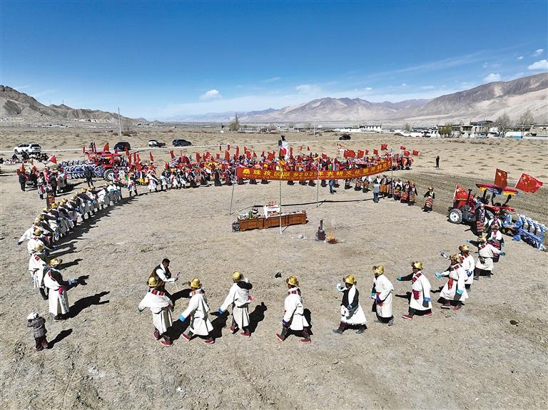 桑珠孜區(qū)聯(lián)鄉(xiāng)差吾慶村春耕春播儀式全景(航拍圖)。
