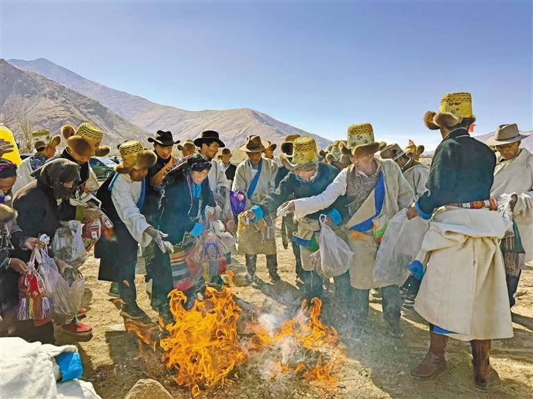 仁布縣群眾撒糌粑祈求風調(diào)雨順?! ?/p>