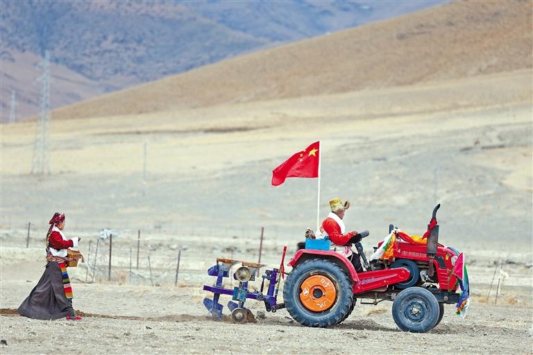 薩嘎縣春耕春播儀式上,村民開著拖拉機在前犁地,婦女在后撒青稞種子?! ?/p>