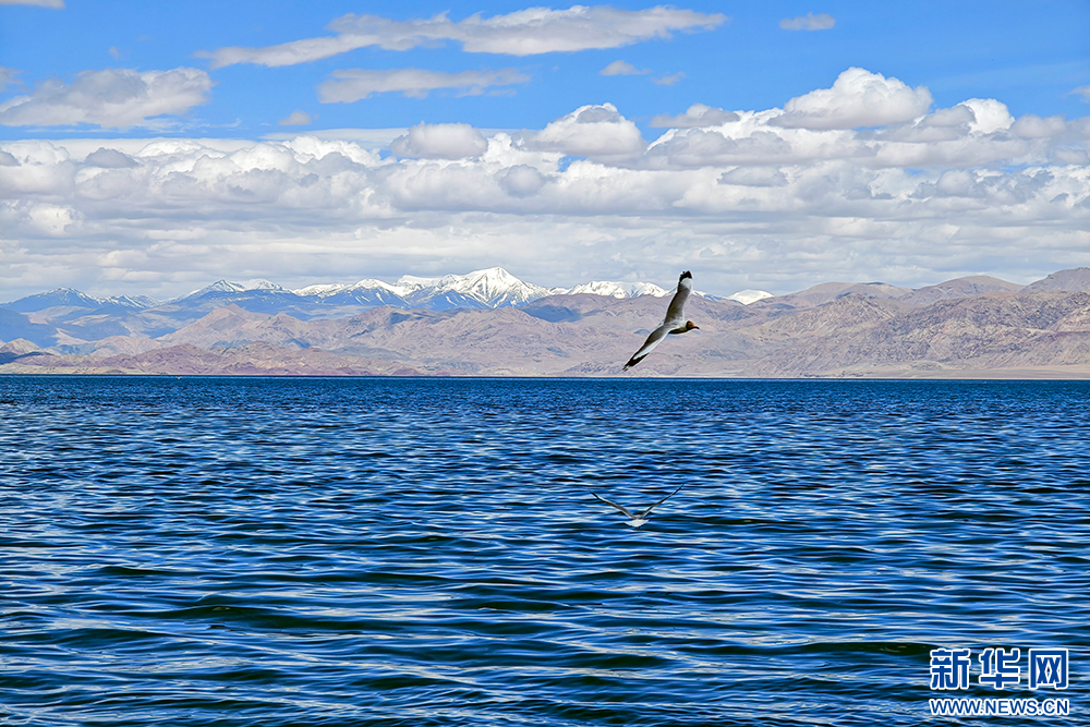藍(lán)天白云映襯下的班公湖(6月15日攝,無人機(jī)照片)。新華網(wǎng) 旦增努布 攝