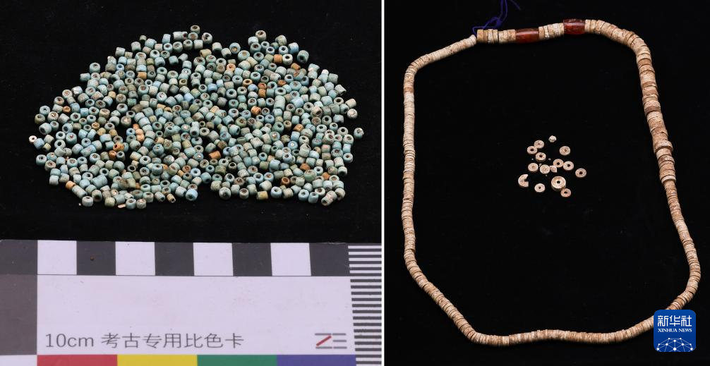 ?這是瑪不錯(cuò)遺址出土的費(fèi)昂斯珠(左)和帶有紅玉髓的滑石珠串(拼版照片)。新華社發(fā)(西藏自治區(qū)文物保護(hù)研究所供圖)