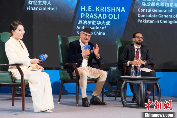 圖為6月27日,尼泊爾駐華大使(中)與巴基斯坦駐成都總領(lǐng)館總領(lǐng)事(右)在“環(huán)喜馬拉雅”企業(yè)家國際會議上參與對話活動。江飛波 攝