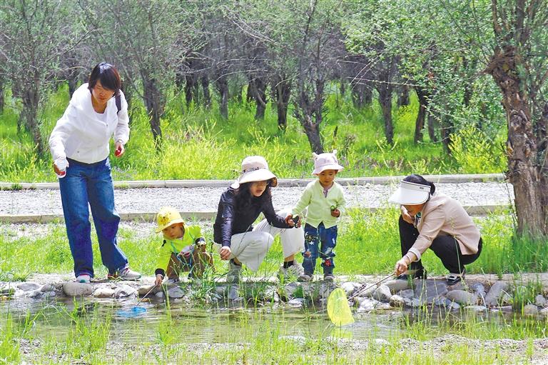 圖為市民和小朋友在林卡的小溪邊玩耍。記者 旦增蘭澤 攝