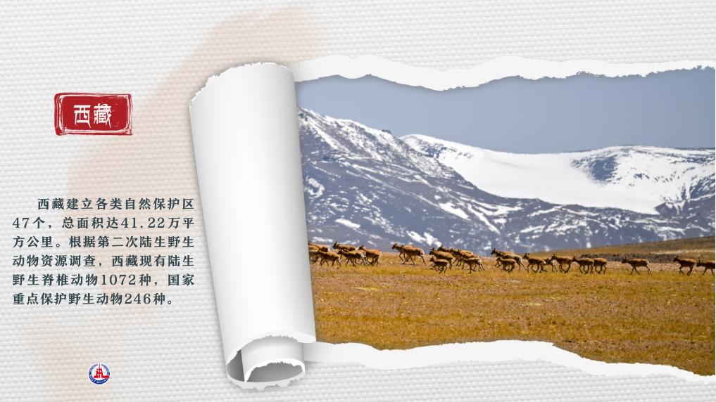 西藏建立各類(lèi)自然保護(hù)區(qū)47個(gè),總面積達(dá)41.22萬(wàn)平方公里。根據(jù)第二次陸生野生動(dòng)物資源調(diào)查,西藏現(xiàn)有陸生野生脊椎動(dòng)物1072種,國(guó)家重點(diǎn)保護(hù)野生動(dòng)物246種。
