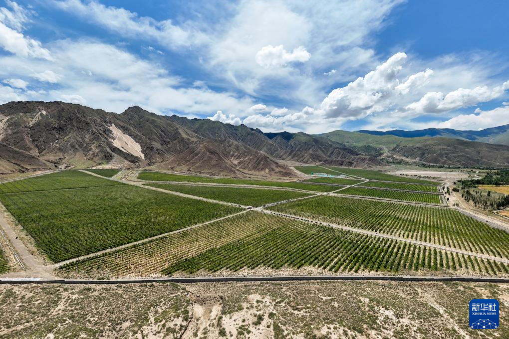 ?這是西藏扎囊縣的一處矮化蘋果種植園區(qū),采用現(xiàn)代農(nóng)業(yè)滴灌技術(shù),使水資源得到高效利用,還可以用果樹防風固沙,讓沙化地變綠洲(無人機照片,7月19日攝)。新華社記者 李鑫 攝 ??
