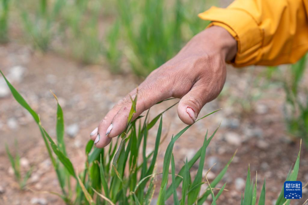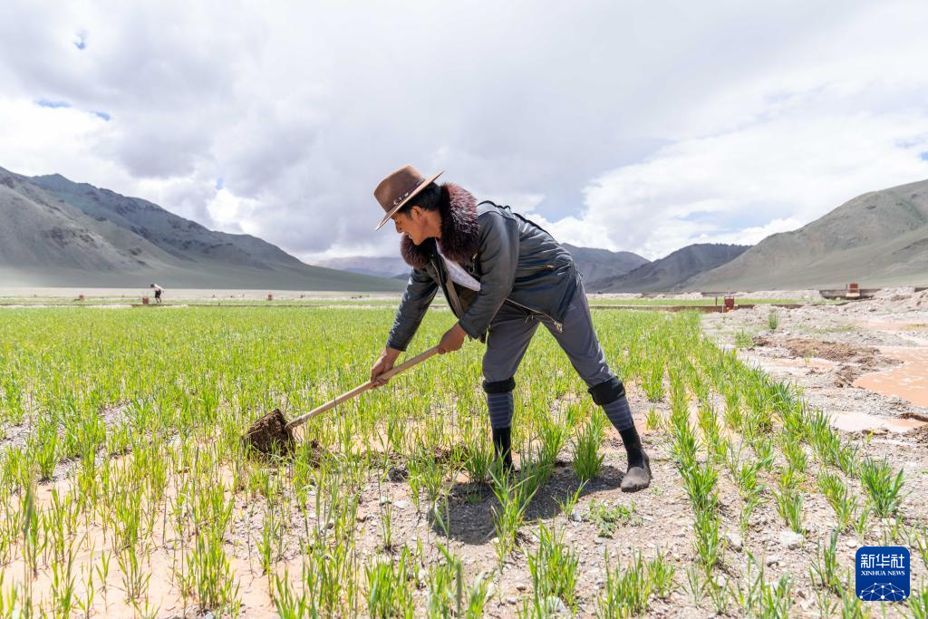 7月20日,西藏阿里地區(qū)革吉縣文布當(dāng)桑鄉(xiāng)夏瑪村村民嘎瑪旺堆在人工種草基地工作。新華社記者 旦增尼瑪曲珠 攝 ??