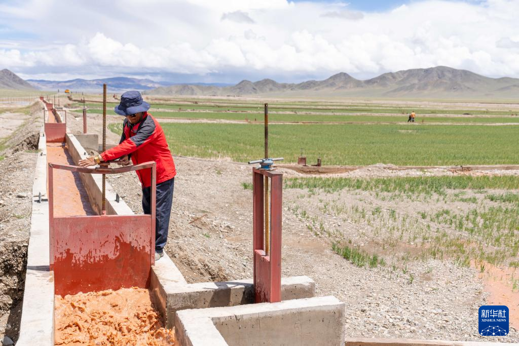 7月20日,西藏阿里地區(qū)革吉縣文布當(dāng)桑鄉(xiāng)夏瑪村村民達(dá)多在人工種草基地工作。新華社記者 旦增尼瑪曲珠 攝 ??