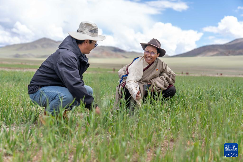 7月20日,文布當(dāng)桑鄉(xiāng)鄉(xiāng)長(zhǎng)拉巴歐珠(左)和夏瑪村黨支部書記努桑在看草的長(zhǎng)勢(shì)。新華社記者 旦增尼瑪曲珠 攝