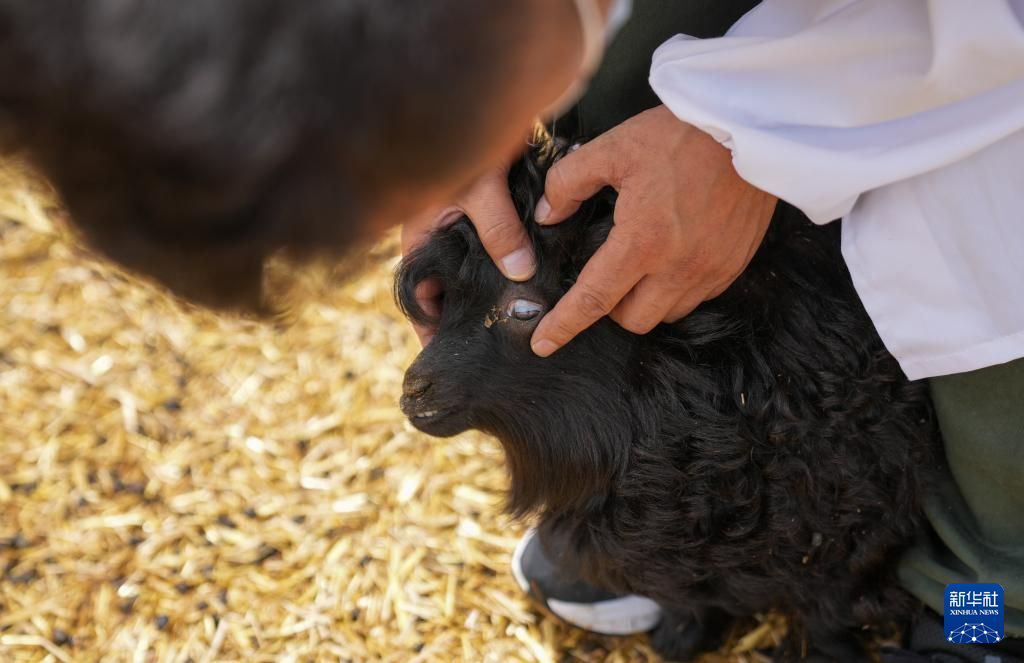 邊壩縣黑山羊養(yǎng)殖基地的工作人員在檢查黑山羊羊羔健康狀況(7月20日攝)。新華社記者 晉美多吉 攝 ??