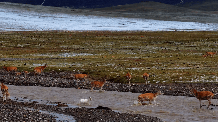 近日,藏羚羊群中,一只罕見的白色小藏羚羊緊隨母親,踏過河水順利抵達(dá)對岸,雪白的身影在群中格外醒目。