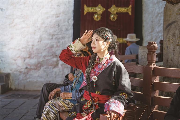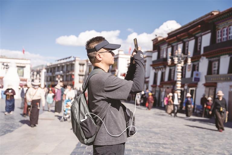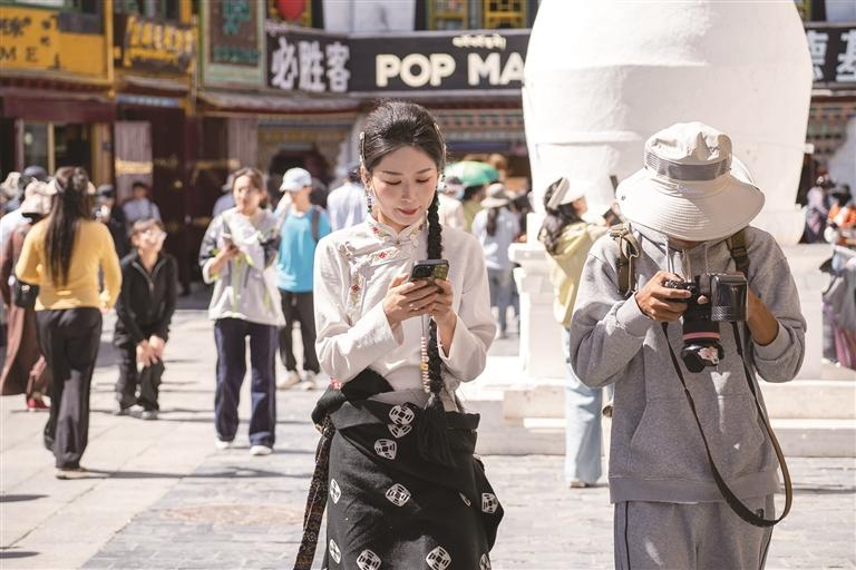 街巷里,來(lái)自五湖四海的游客們開始穿梭在八廓街蜿蜒曲折的街巷中。他們滿懷好奇,感受著這里獨(dú)特的風(fēng)土人情。不少游客興致勃勃地穿上一套精美的藏裝,搖身一變成為高原上美麗的“卓瑪”與帥氣的“扎西”。他們?cè)诠沤值拿恳粋€(gè)角落留下自己的身影,臉上洋溢著對(duì)這片土地的喜愛與贊嘆。