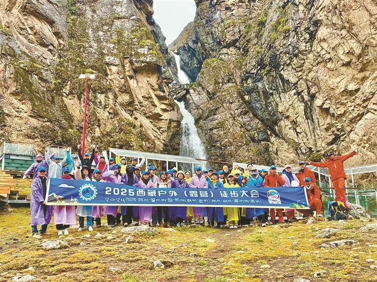 圖為參加西藏戶(hù)外(露營(yíng))徒步大會(huì)的戶(hù)外徒步愛(ài)好者在曲加瀑布前合影。記者 歐珠次仁 攝