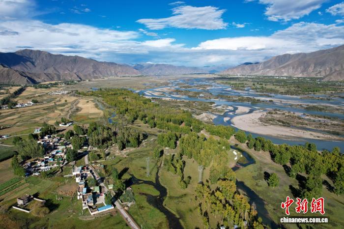 9月20日,拉薩河畔神秘樹林風(fēng)光,據(jù)悉該樹林以前為荒灘。(無人機畫面)中新社記者 江飛波 攝