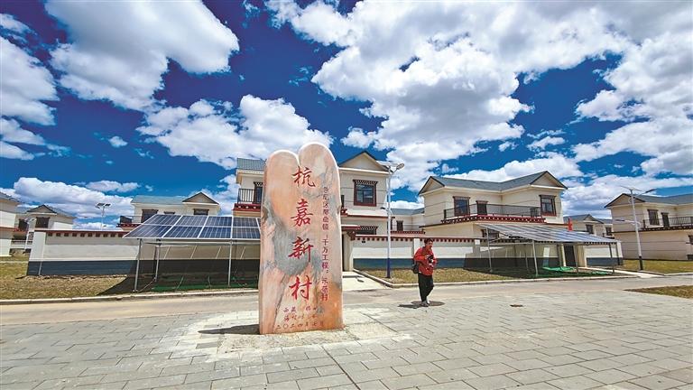 下高速后,沿著嶄新的鄉(xiāng)村鋪裝路面,幾分鐘便可到達杭嘉新村。85套裝配式結構的民房映入眼簾,兼具藏式民居和江南水鄉(xiāng)特色的建筑造型,是浙藏兩地交往交流交融的美麗結晶。