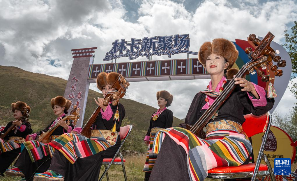 在山南市瓊結(jié)縣強(qiáng)吉村第二屆林卡大會(huì)現(xiàn)場(chǎng),演員們?cè)诒硌莨?jié)目(9月13日攝)。新華社記者 丁增尼達(dá) 攝