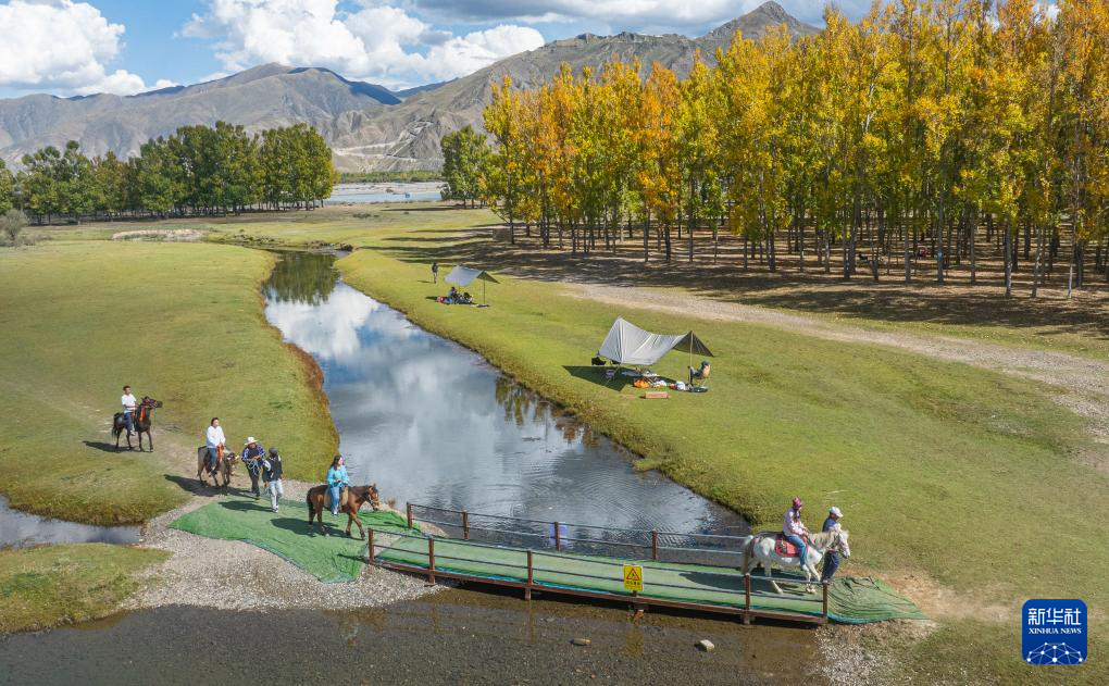 游客們?cè)诶_市林周縣“神秘樹林”林卡營(yíng)地體驗(yàn)騎馬(9月27日攝,無(wú)人機(jī)照片)。新華社記者 丁增尼達(dá) 攝??