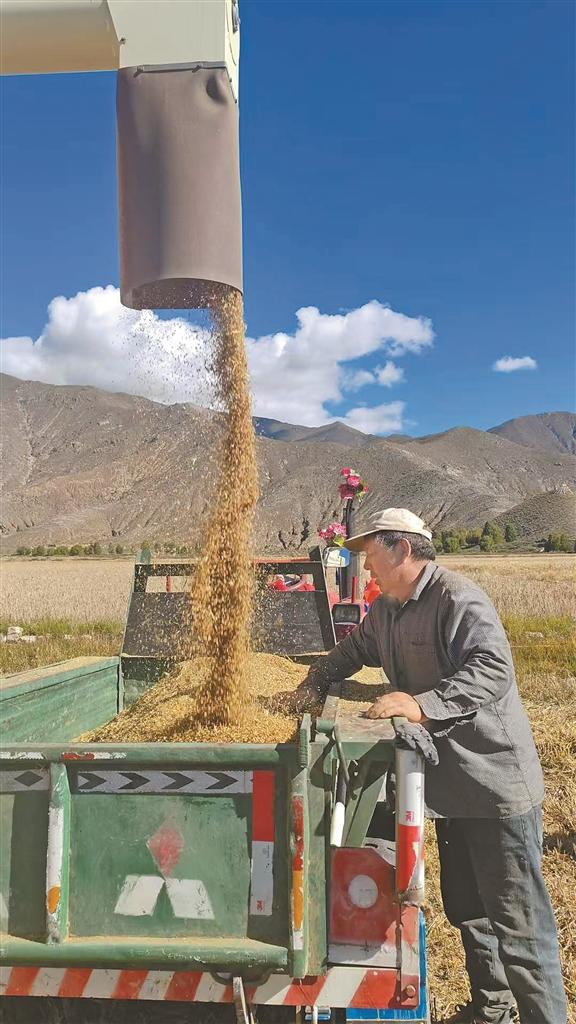 桑珠孜區(qū)東嘎鄉(xiāng)色定村正在進行機械化收割。